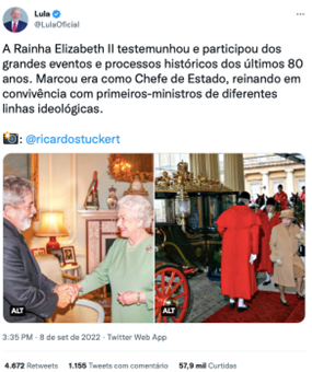 O mês de setembro iniciou na expectativa dos atos do dia 07, convocados em nome dos valores bolsonaristas de liberdade de expressão, conservadorismo e fé, antagonismo da mídia, das pesquisas de intenção de voto, na adversidade aos tribunais superiores e o processo eleitoral. A data nacional foi sequestrada pela campanha do presidente e tornou-se efetivamente em um palanque, fornecendo conteúdo audiovisual para ser utilizado como prova do “DataPovo” – termo usado por apoiadores do presidente como forma de contrapor os institutos de pesquisa, uma espécie de demonstração de intenção de votos através da análise visual quantitativa de manifestantes em eventos, comícios e motociatas. Esse grande palanque bolsonarista foi solapado pelo falecimento da Rainha Elizabeth no dia seguinte. O post de Lula em homenagem à Rainha teve o dobro de likes que a principal postagem de Bolsonaro. Essa foi a primeira vez que o bolsonarismo perdeu o controle da agenda em todo o período eleitoral.