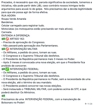 Figura 3 – Mensagem divulgada em grupos bolsonaristas no WhatsApp sobre Artigo 142, Intervenção Militar e Federal
