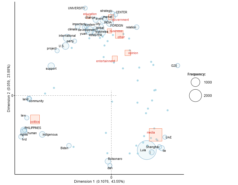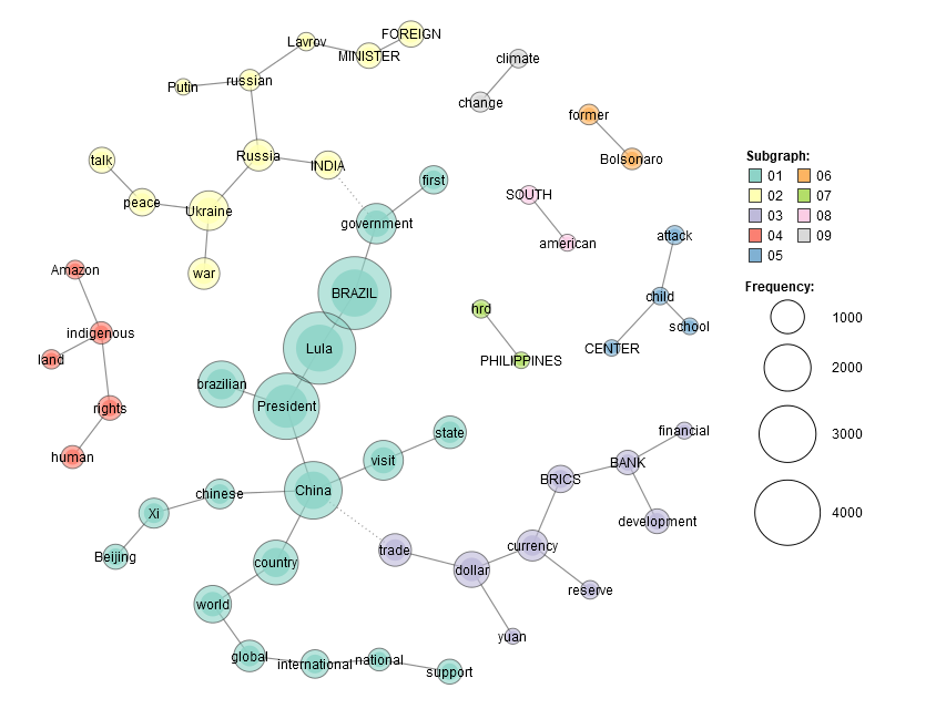Os grupos Entertainment e Opinion não tiveram palavras aproximadas que demonstrassem relevância, demonstrando difusão. Já os grupos Education, Government, Business e Other tiveram diversos termos próximos e extremamente interligados. A visita do Ministro das Relações Exteriores da Rússia ao Brasil no mês de abril está ligada aos termos “FOREIGN” e “MINISTER”. Os termos “climate” e “change” estão relacionados com os discursos do presidente Lula no mês de maio e junho em relação às mudanças climáticas, sobre os quais o líder anunciou medidas para combater a crise que está próxima de se tornar ‘irreversível’. Com a tentativa da China de desestabilizar a dolarização a a hegemonia da moeda, substituindo-a pelo Yuan chinês, os termos “yuan”, “market” e “business” podem obter inferências sobre o tópico. Dada a possível transformação do Sistema Internacional, os termos “global” e “system” também têm proximidade com os citados anteriormente. Brasil e Índia, que participaram como convidados na cúpula do G-7 em maio, discutiram a parceria estratégica entre os dois países. O primeiro-ministro indiano, Narendra Modi, e o presidente brasileiro, Lula, concordaram em fortalecer os laços entre suas nações, o que é evidenciado pela presença das palavras “INDIA”, “strategic” e “relation”. O grupo Politics abrange termos como “PHILIPPINES”, “indigenous”, “hrd” (Desenvolvimento de Recursos Humanos), “human” e “rights”, além de ter uma certa proximidade com o termo “land”. Essas palavras estão interligadas uma vez que o PL 490/2007 teve seu julgamento retomado em junho, voltando a ser alvo de diversas críticas pelos militantes da causa, inclusive do presidente Lula. O projeto visa estabelecer um marco temporal na demarcação de terras indígenas brasileiras, tornando legítimos apenas os territórios já ocupados antes da promulgação da Constituição brasileira de 1988. Tal ação foi tida como argumento pelos militantes dos direitos indígenas para demonstrar a necessidade de luta constante pelas terras dos povos originários. Apesar disto, em maio de 2023, a organização Business & Human Rights Resource Centre publicou um levantamento com os países mais perigosos para ativistas, no topo da lista está o Brasil, com 63 ataques e as Filipinas em quinto, com 32. Dentre os ataques de todos os países do levantamento somam-se 555 ataques em 2022, sendo 75% destes contra defensoras de pautas ligadas ao clima, terra e meio ambiente e mais de 23% foram direcionados a defensores dos direitos indígenas. O que chamou a atenção neste levantamento anual é a velocidade nas variações: enquanto as agressões contra ativistas diminuem nas Filipinas, essas violações dos direitos humanos tornam-se cada vez mais recorrentes no Brasil, ambas rapidamente.