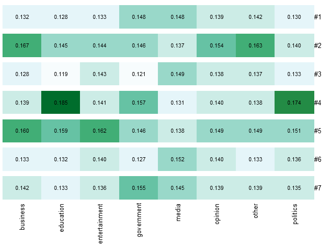 Business: Questões de mercado, com termos como dólar, economia, mundo e global, foram abordados pelo tópico #2 e também, mesmo de modo difuso, termos voltados à segurança, no tópico #5, foram os mais relevantes ao Grupo Business.